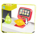 - Setul include: magazin mare cu mai multe locuri de joaca: casa de marcat, mini-standuri, frigider, colt de fructe / legume, cantar, casa de marcat electronica cu display LCD integrat, sertar pentru bani, scaner cu sunete si lumini, ceas si panou de informatii (deschis / inchis), cantar, frigider, microfon (decorativ, fara functii), terminal card de credit cu chitante, cos de cumparaturi, monede si bancnote, card de credit, 4 chitante, paine, legume si fructe, produselor alimentare