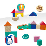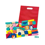Contine: 47 de blocuri de lemn in diverse forme si culori; 3 figurine din lemn cu cap de animal; geanta de depozitare.