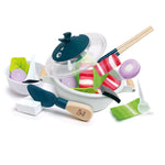 Acest set de joaca colorat include o oala, betisoare, cutit de joaca, lingura si imitatii de ingrediente proaspete. Este dragut si captivant, la fel ca si copilul tau!