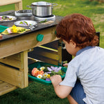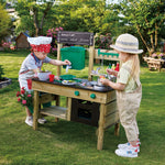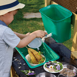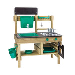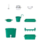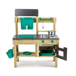Jucarie din lemn - Bucatarie cu accesorii pentru copii, de exterior (14 piese) - Prescolarii abia asteapta sa puna mana pe aceste accesorii dragute: o oala, un polonic, doua boluri, doua ghivece de flori, o sita, rezervor de apa, chiuveta, robinet si tava pentru cuptor. Jucaria perfecta in curte pentru un copil ocupat.