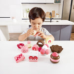 Setul de desert cu capsuni are o cupcake dragut iepuras, tort patrat, rulouri elvetiene cu ciocolata neagra si alba si prajituri cu crema de ciocolata. Detaliile realiste iti vor tine copilul fericit ore in sir!