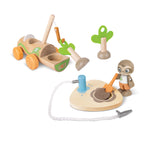 Jucarie din lemn - Plantarea copacilor E-car (7 piese) - Aceasta masina „electrica†este mai mult decat atat – sapa, planteaza copaci si este reincarcata de propria turbina eoliana rotativa, conectata la un copac cu un hamac! Micul sofer de lenes este cat se poate de dragut.