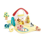 Portabil datorita gaurii de mana de pe acoperis si a covorasului pliabil. Covorasul poate fi detasat pentru spalare. Diverse materiale ofera note bogate. O oglinda actioneaza ca o piscina. Tema cu animale de la ferma.