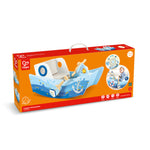 Barca este decorata in culori albastre vibrante pentru a incuraja imaginatia si creativitatea copilului dumneavoastra in timp ce se joaca.