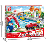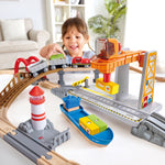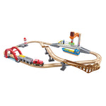 Jucarie din lemn - Set de transport maritim si feroviar (38 piese) - Acest set include sase sine curbate mici, doua sine curbate mari, doua sine drepte de sase inci, cinci sine drepte de patru inci, o sina dreapta de doi inci, doua sine Y, o sina S, o pista ascendenta, o pista sonora , un far, o nava, o macara, o locomotiva, doua vagoane, patru blocuri de marfa, un pod de ridicare, trei piloni de pod, doua figuri si un semn.