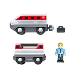 Acest tren poate fi folosit pentru joaca independenta sau cu majoritatea garniturilor de cai ferate din lemn.